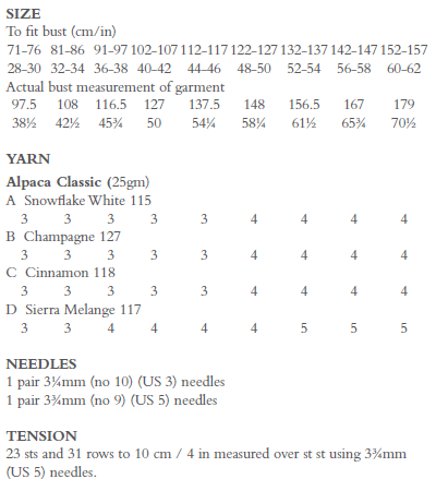 Designed by Quail Studio, this colourblock sweater is worked in stocking stitch throughout and uses four contrasting colours of the beautifully lightweight Alpaca Classic. This sweater features long, drop-shoulder sleeves, a relaxed slash neck and rib details at the cuffs and hem.