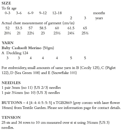 This classic cardigan is a great basic with loose fitting sleeves. A useful layer that can be personalized and made extra special with a little bit of embroidery. Shown with a strawberry patch embellishment but would work for a variety of favourite things! Please note for the embroidery you will need small amounts of Baby Cashsoft Merino in Cecily 125, Piglet 122, Sea Green 108 and Snowflake 101.