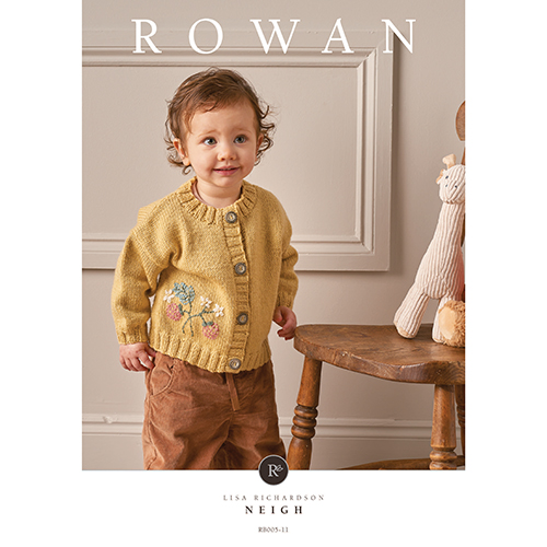 This classic cardigan is a great basic with loose fitting sleeves. A useful layer that can be personalized and made extra special with a little bit of embroidery. Shown with a strawberry patch embellishment but would work for a variety of favourite things! Please note for the embroidery you will need small amounts of Baby Cashsoft Merino in Cecily 125, Piglet 122, Sea Green 108 and Snowflake 101.