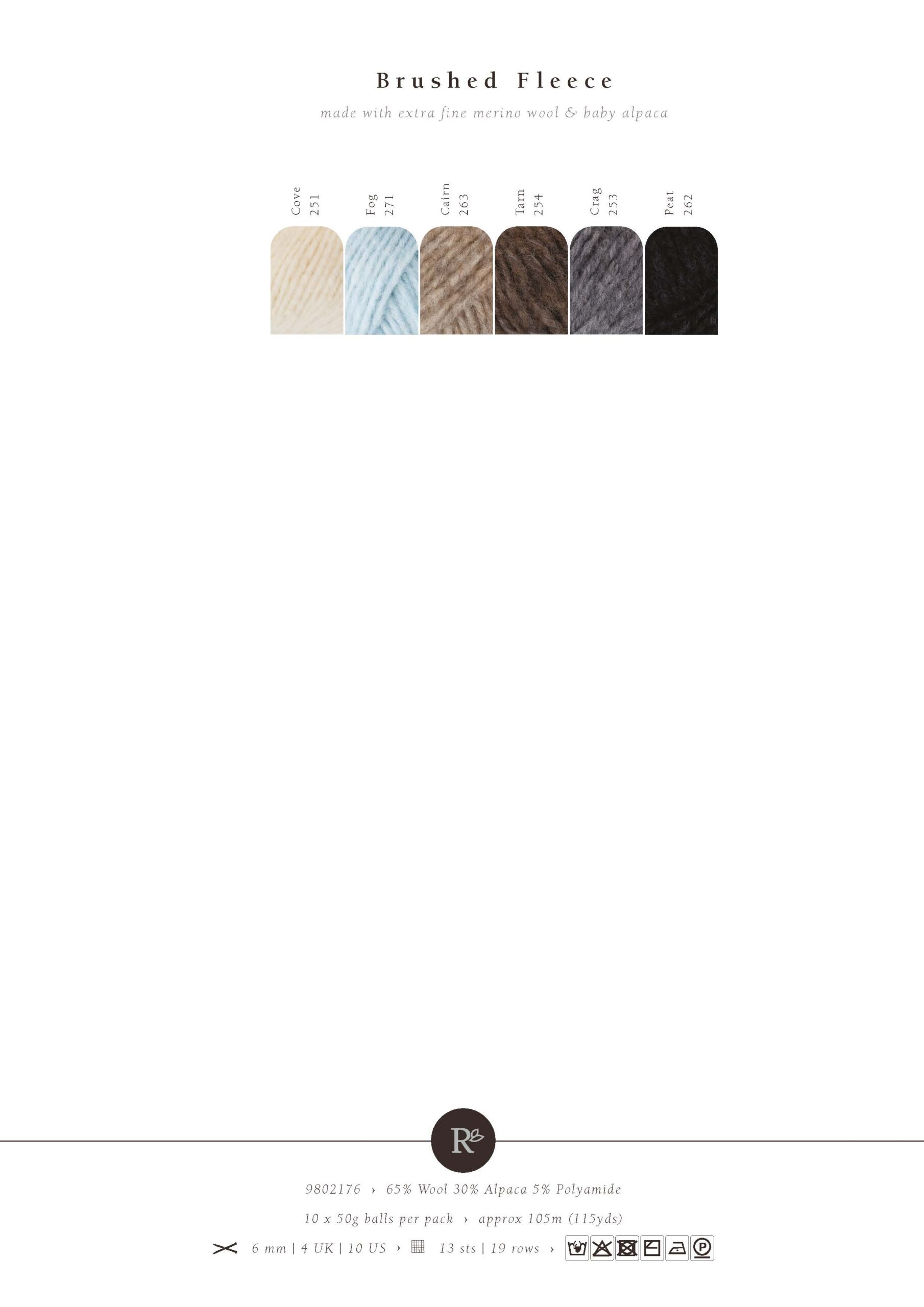 A perfect choice for warming winter knits, Brushed Fleece has a gentle halo and soft marl colour effect that combines beautifully with its palette of soft neutrals. Due to its chunky finish Brushed Fleece is quick to knit, but it’s very much a lightweight yarn that’s easy to wear and super cosy thanks to its blend of alpaca, wool and polyamide.