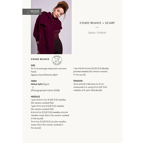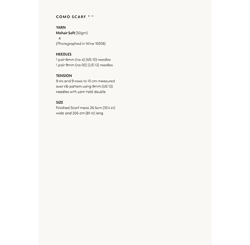 Textured beanie in stocking stitch with a folded ribbed brim. A cosy piece for those colder days. Como scarf uses two different sized needles, worked in a rib stitch with elongated stitches created by wrapping the yarn round the needle multiple times and droppping on the following row.