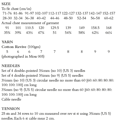 This elegant crew neck sweater from Lisa Richardson is knitted top down and in the round using one shade of Cotton Revive. A cable stitch pattern fans out from the neckline travelling down the body and sleeves contrasting beautifully with a reverse stocking stitch background. The hem and cuffs are worked in rib.