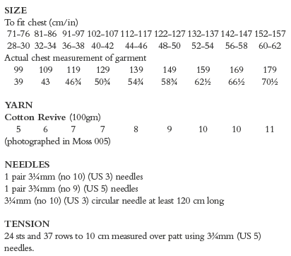 This lightweight edge to edge short sleeve cardigan from Martin Storey is knitted using one shade of Cotton Revive. A classic piece that can be styled to suit any occasion. A broken rib pattern is worked over the body with uneven rib stitch details on the sleeves and front bands.