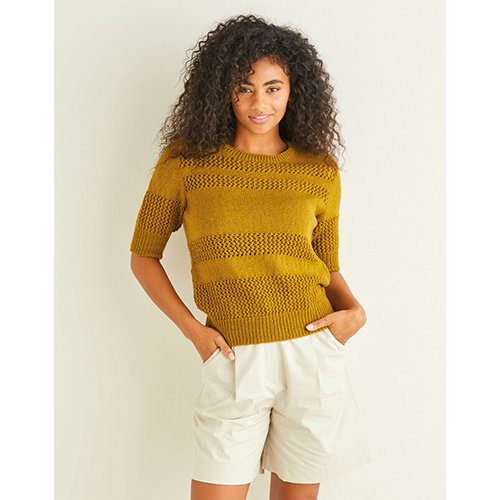 Part of our Modern Explorer collection featuring neat, nipped-in tops and flattering cardigans, this short-sleeved sweater in lightweight Sirdar Country Classic 4 Ply features cool lacy panels. Choose your favourite safari-friendly neutral shade in this pure merino wool blend, to complement your skin-tone and wardrobe.