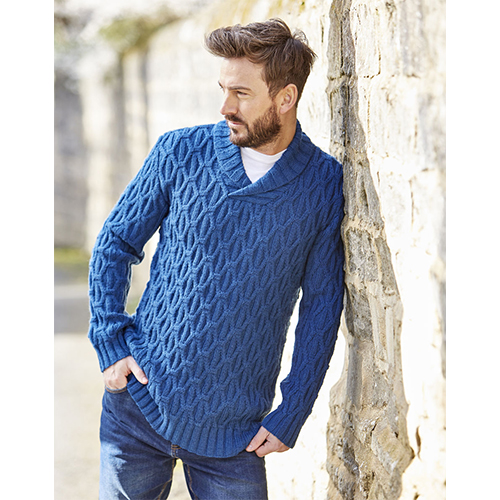 With all over cables, this shawl collared sweater has a geometric feel. Knitted in Sirdar Country Classic, this soft, cosy sweater can be made in sizes S to XXXL.