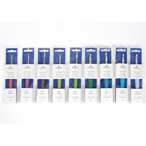 High quality DMC aluminium crochet hooks with soft silicone handles that are colour coded to it’s easy to grab the size you need.