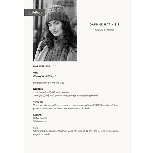 A stylish Beanie with ribbed detail, knitted flat or in the round. The set includes a matching ribbed and cable stitched bib for cosy layering.