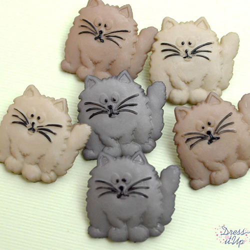 So much more to love. This button set includes three pairs, six total, fat cat buttons in tan, brown, and grey. These adorable buttons are perfect for create decor or gifts for any cat lover. Embellish DIY treat containers, photos, cat collars, and more. (Previously listed as 6123)