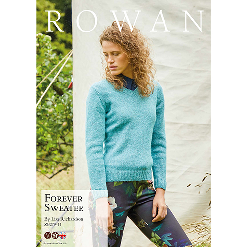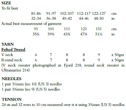 This sweater available in either a round or V-neck, can be worn with many of the pieces in the Kaffe Fassett’s Felted Tweed collection. The ribbed hem and cuffs give a wonderful form-fitting silhouette that contrasts nicely with the stocking stitch body. A classic sweater that is great for layering.
