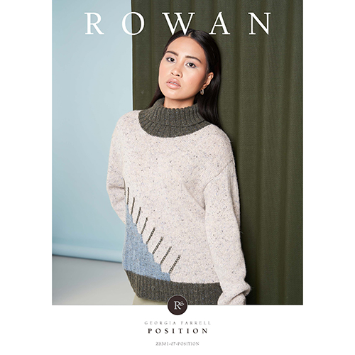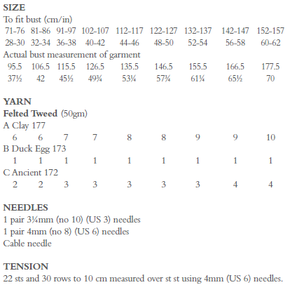 Designed by Georgia Farrell, this funnel neck sweater features a stepped, asymmetrical intarsia design on the front. Knitted in the ever popular Felted Tweed, using stocking stitch throughout, the sweater also features long sleeves and contrast colour ribbing at the neck, cuffs and hem.