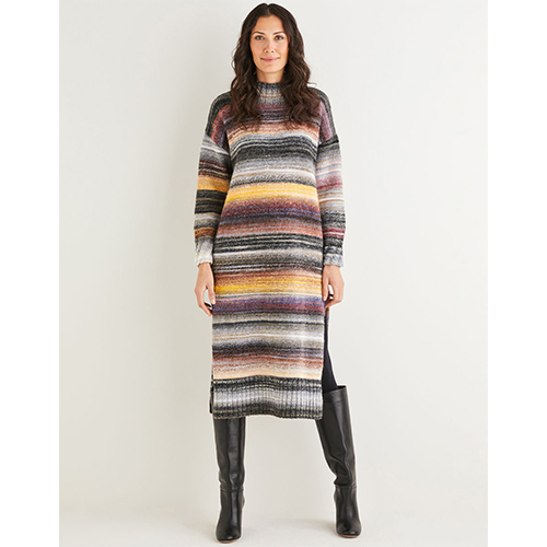This laidback long-sleeved tunic dress in our Sirdar Jewelspun Aran adds a touch of colour to your knit without having to switch between yarns. Featuring a funnel neck, split seam and dropped shoulders for a snug fit. Style it with your favourite knee-high boots to finish off the look.