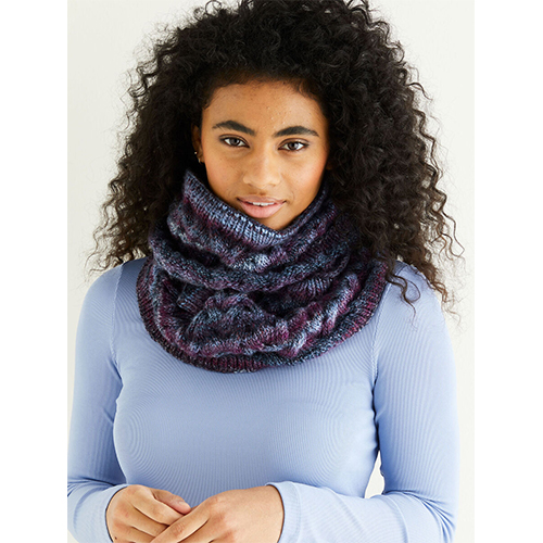 Inspire your winter evenings, with this snood knitted in Nordic Noir colourway. A lovely project to introduce you to working with our Jewelspun yarn. Create your own snood to light up the night.