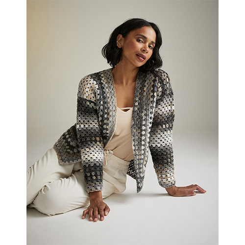 Take a granny stripe crochet pattern into elegant daywear with the Moon & Stars Cardigan in Sirdar Jewelspun. The neat construction of this smart edge-to-edge crochet cardigan features a wide, all-round granny stripe border to create a tailored look in easy-to-wear crochet.