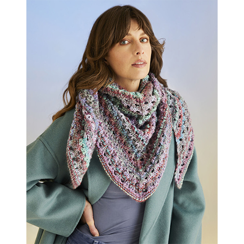 A two-ball Jewelspun With Wool project, the knitting pattern for the Sea Shells Shawl starts at the widest edge. Double increasing as you knit the pretty eyelet pattern creates a feature of the centre line. The garter stitch border helps prevent curling.