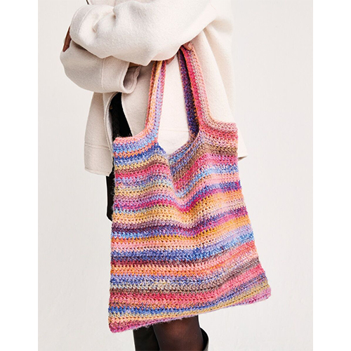 An easy crochet bag pattern great for beginners. Work the Crystal Crochet Bag in half trebles in the round on a 6mm hook to create a structured but flexible fabric. Create the integrated handles by adding chain stitches and working into with half trebles. A simple way to add colourful Sirdar Jewelspun With Wool stripes to any outfit. Sirdar Jewelspun With Wool is a self-striping easy care chunky weight yarn, with a hand dyed, handspun look.