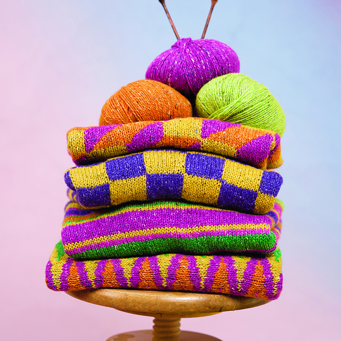 In a vibrant, curated colour palette by renowned designer Kaffe Fassett, this collection of eight designs showcases his new shades of Felted Tweed and Kidsilk Haze. In Kaffes signature style these knitwear pieces sweaters, a cardigan, a tank top and accessories – let the striking geometric patterns and vibrant colour combinations take centre stage, a celebration of colorwork knitting.