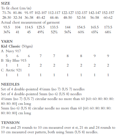 Knitted top-down and in-the-round, this crew neck, raglan sweater by Georgia Farrell is a stylish winter knit. Using three shades of Kid Classic, this useful everyday sweater features a wide band of textured Fair Isle around the bottom of the body and sleeves, echoed in the wide ribs at the hem, cuffs and folded neck band.