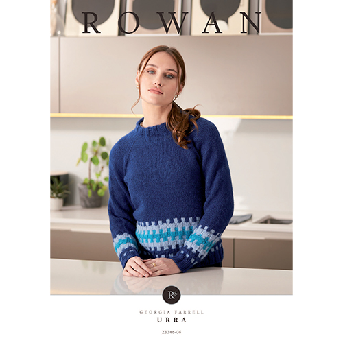 Knitted top-down and in-the-round, this crew neck, raglan sweater by Georgia Farrell is a stylish winter knit. Using three shades of Kid Classic, this useful everyday sweater features a wide band of textured Fair Isle around the bottom of the body and sleeves, echoed in the wide ribs at the hem, cuffs and folded neck band.