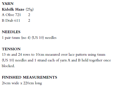 Knitted accessories are a great addition to your wardrobe all year round and this lacy scarf from Quail Studio is perfect for taking you from spring into summer. It is knitted using two shades of Kidsilk Haze held together for a luxuriously sumptuous look and feel.