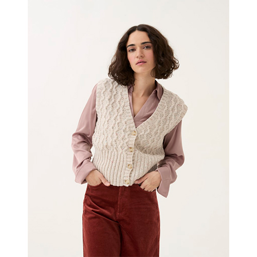 With travelling cables, moss stitch and a deep, ribbed hem, this versatile retro-inspired vest knitting pattern is brought up-to-date with a modern silhouette. The tweedy neps of Sirdar Loveful 100% Recycled Tweed Blend, will add even more interest to the textured stitches of this knitting pattern.