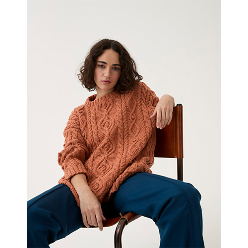 A fun pattern for fans of cable knitting, this sweater features travelling cable, rope cables and diamond cables with Irish moss stitch insets. With all those cables going on, the shaping in this knitting pattern is all within the reverse stocking stitch background to keep things simple. The tweedy neps of Sirdar Loveful 100% Recycled Tweed Blend will beautifully enhance those stitch details.