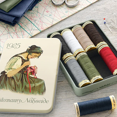 Storage box with nostalgic advertising motif, containing 8 reels of Sew-all Thread 100 m. Sew-all Thread, the right thread for all fabrics and seams.
