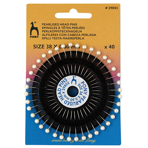 White pearl head rosette pins in a handy plastic wheel. 38mm pin length