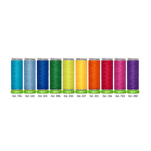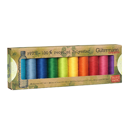 10 spools Sew-all Thread rPET 100 m sorted by colour. Sew-all Thread rPET is 100 % manufactured from recycled PET bottles.