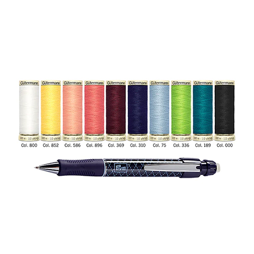 10 spools of Sew-all Thread 100 m and a cartridge pencil by PRYM for marking sewing and patchwork projects. The fine cartridge pencil (0.9 mm) allows particularly precise lines. The marks can be completely removed by washing.