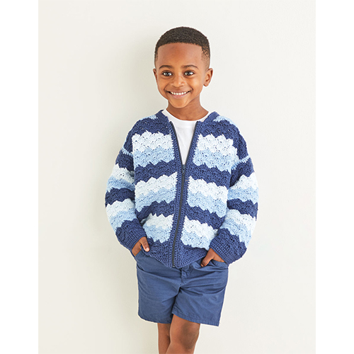 Crochet a wave-stitch jacket for their seaside adventures, real or imagined. Soft, pure cotton will keep them comfortable on changeable days that call for an extra layer. The zip-up front makes it easy for your independent little sailors to get themselves dressed, and undressed, whenever they need to.