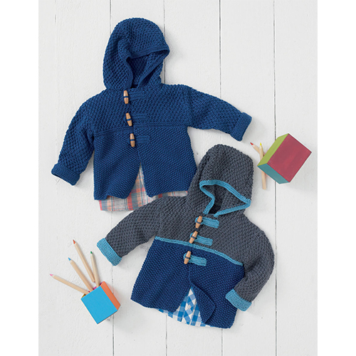 Baby boy’s duffle coat knitted in 1 shade or 3 from birth to 3 years in an incredibly smooth yarn spun from natural bamboo and wool fibres remaining soft for your baby wash after wash.