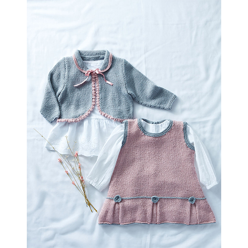 Pleats, picot edging and garter stitch trims bring this duo of knits together. The pattern includes a pinafore dress and matching cropped cardigan that knit up beautifully in Sirdar Baby Bamboo Double Knitting. Make this adorable set for a newborn or a child up to two years.