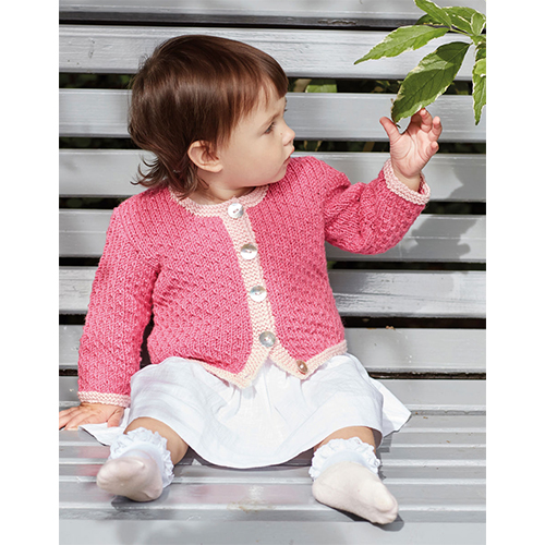 This round neck cardigan is knitted in Sirdar Snuggly Cashmere Merino, which gives it such excellent stitch definition. It is knitted in stocking stitch, with decorative purl stitches throughout, and contrast garter stitch trims. The pattern includes instructions for ages from newborn to three years.