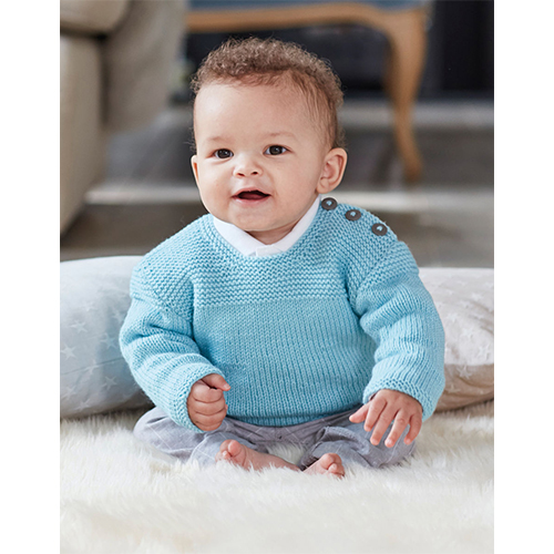 Cute round neck sweater, knitted in Sirdar Snuggly Cashmere Merino. The main body of the sweater is knitted in stocking stitch, with a garter stitch yoke and trims, and a shoulder button fastening. The pattern includes instructions for ages from newborn to three years.