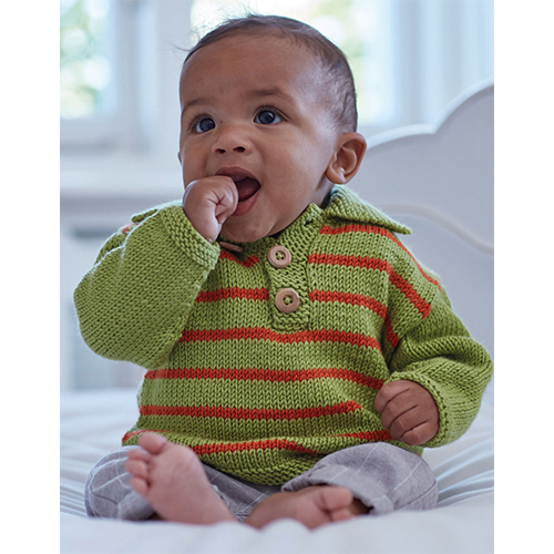 Try your hand at this cute stocking stitch sweater with garter stitch collar detail, aimed at intermediate knitters. Whether you opt for the plain or stripy version, you’ll enjoy knitting with luxurious, machine washable Sirdar Cashmere Merino. With instructions for sizes from newborn up to three years, this cosy sweater would make a great addition to a little one’s wardrobe.