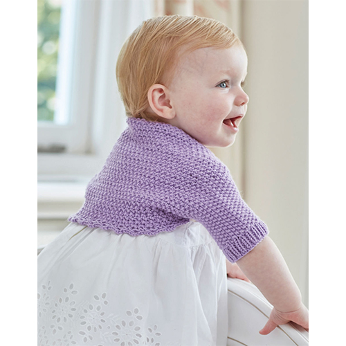 An adorable moss stitch bolero that is knitted in one piece. Starting with one sleeve, you then knit across the body section, finishing with the other sleeve. Knitted in Sirdar Snuggly Cashmere Merino this bolero has great stitch definition. The pattern is written for sizes from newborn to three years.