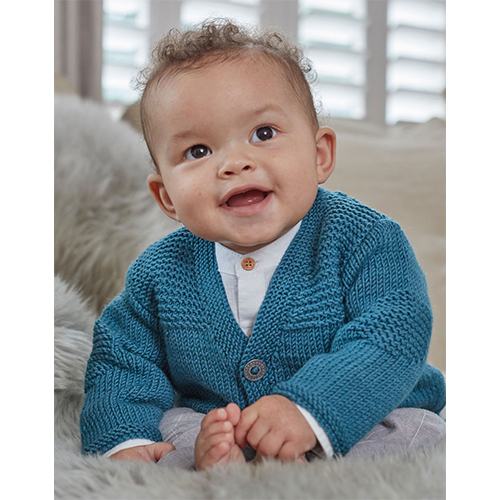 This V neck cardigan is knitted in Sirdar Snuggly Cashmere Merino, available in a wide range of colours. The cute garter stitch elbow patches and trims are a fun contrast against the stocking stitch body. With the option of a shawl collar or rib trim you’ll want to knit this pattern over and over so we’ve included instructions for babies from newborn to three years.