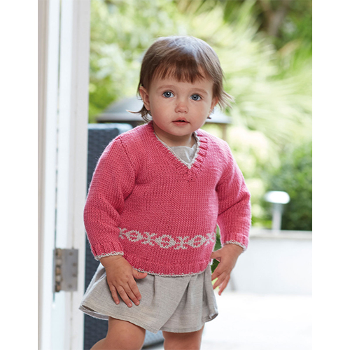 Take your pick from this V-neck sweater or vest. Both designs have contrasting edging at the ribbing and stranded colourwork detail. Both styles are created in Sirdar Snuggly Cashmere Merino yarn for a super-soft feel and easy-care practicality and can be made for ages from newborn to three years.