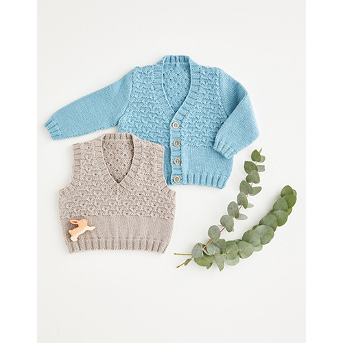 These textured knits are extra soft and super cosy knitted in a blend of gentle cashmere, pure merino wool and silk. Choose from a cardigan or a slipover or why not knit both? Either would make a lovely gift or an extra special outfit for your little one.