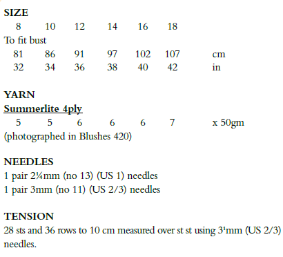 Knit this simple stylish top, designed by Grace Melville, using our beautiful soft matt cotton Summerlite 4ply. This round neck top has cap sleeves and is a wardrobe essential for the summer.