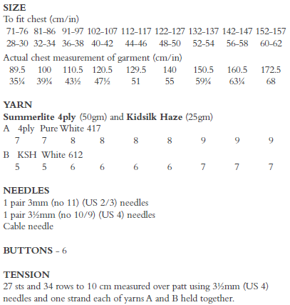 This elegant lace cardigan from Chloe Thurlow is knitted using Summerlite 4ply and Kidsilk Haze. Featuring a lace and cable pattern all over and finished with a ribbed hem, neckline, cuffs and button bands. Raglan sleeves create a relaxed silhouette.