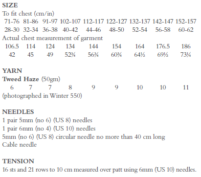 This easygoing stocking stitch sweater by Martin Storey is punctuated by blocks of cable across the body and sleeves. This interesting use of texture adds interest, whilst echoing the cabled borders. With a high neck and drop sleeves, this is a flattering autumnal essential.
