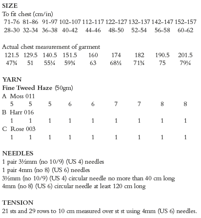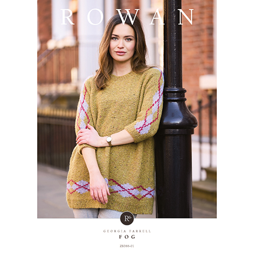 This oversized sweater has a loose fitting body with a tight cropped sleeve. Designed by Georgia Farrell, the sweater is knitted using three shades of Fine Tweed Haze. It is knitted in a single sideways piece with the argyle pattern worked in both intarsia and fairisle on the sleeves and hem. A round neck worked in rib completes this flattering piece.