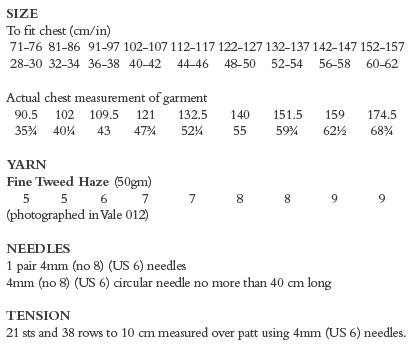 A slip stitch rib and garter stitch pattern gives this Georgia Farrell sweater a lovely texture. Worked in a single shade of Fine Tweed Haze the long sleeves and funnel neck shaping make this the perfect cosy project for this Autumn/Winter.