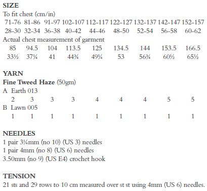 This simple tank by Lisa Richardson is sure to become a wardrobe staple this Autumn/Winter season. The stocking stitch body is worked in two shades of Fine Tweed Haze. The hem is worked in rib. A double crochet border in a contrast colour adds a pop of colour on the round neckband and arm bands.