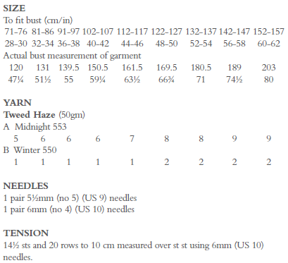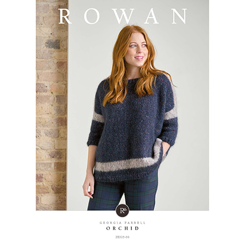 Orchid by Georgia Farrell oozes easygoing style. This two-colour sweater uses clever colour placement to highlight the relaxed saddle shoulder and flattering three-quarter length sleeves, edged with a fishermans rib. The flecks of accent colours in the Tweed Haze really shine in this chic wardrobe essential.